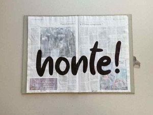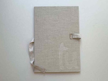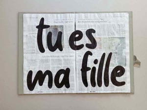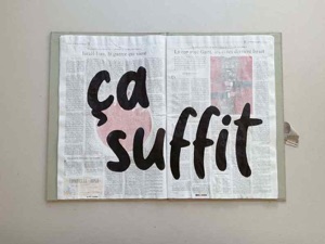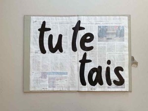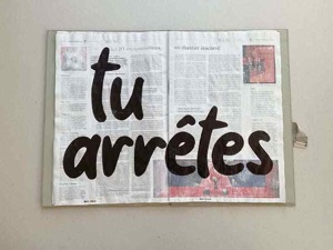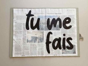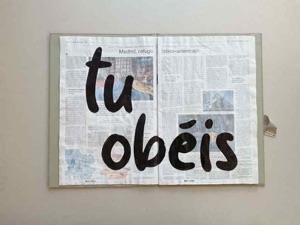 L'impression typographique à l'encre satinée contraste avec l'apprêt rugueux qui recouvre le journal. Les nouvelles et images restent lisibles, résonnent parfois pertinemment avec les injonctions. Le journal se referme dans une chemise cartonnée rigide, sanglée. Un discret embossage sur le couverture ébauche le contenu : tu...